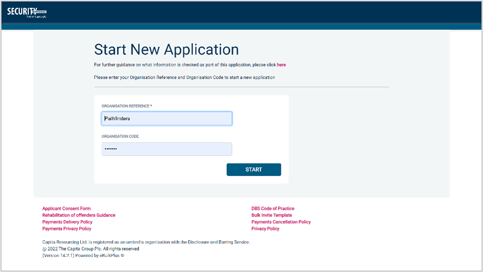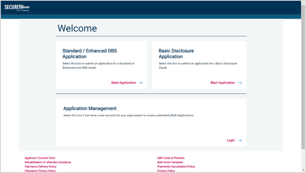 Please click on “Start Application »” in the box “Standard/Enhanced (DBS) Application”.