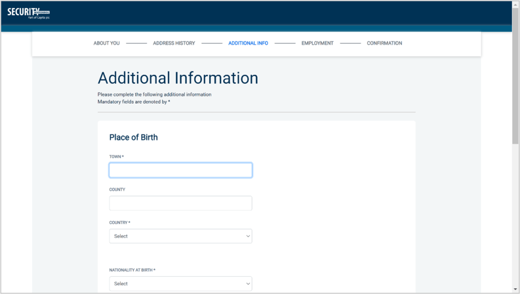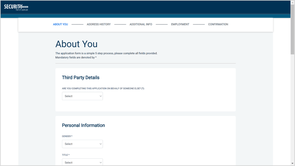 The application form is a simple 5 step process. Please complete as fully as possible. Mandatory fields are denoted by (*).