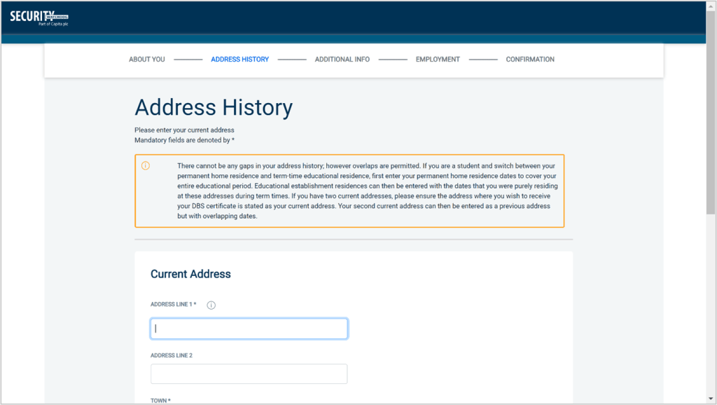 Please enter your current address. If you haven’t lived at this property for more than five years, you will be taken to another screen. Here you will be required to add any additional addresses to ensure your address history goes back the required five years. Please note if you do not provide a minimum of five years of address history, you will not be able to proceed to the next stage of the application process.